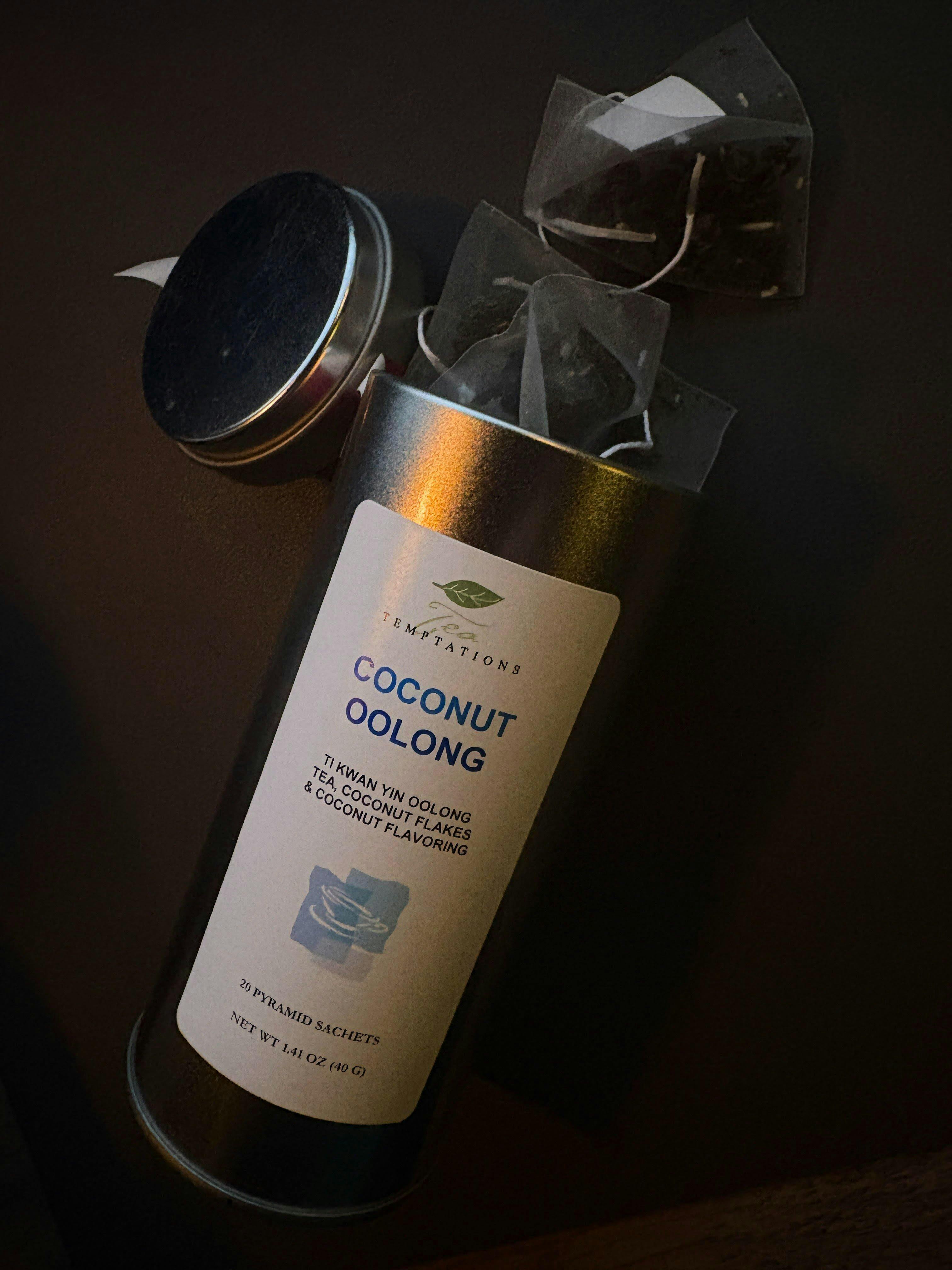 20 Pyramid tea sachets in a tin - Ti Kwan Yin semi oxidized Oolong tea, Coconut flakes and flavoring.